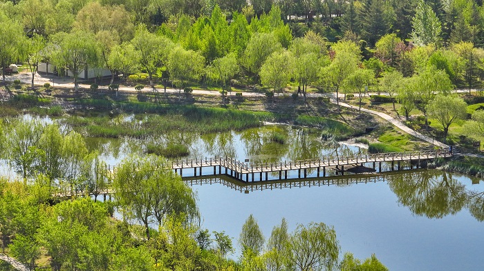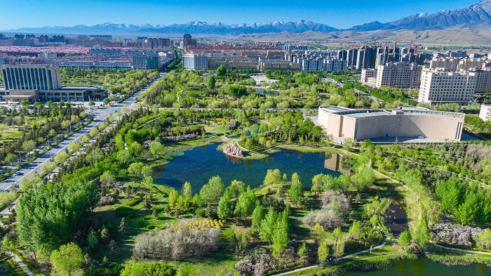 初夏时节,位于祁连山北麓的甘肃省张掖市民乐县城北生态公园绿树成荫,郁郁葱葱,与城市楼宇和连绵起伏的雪山相映,行走在每一个角落,仿佛置身于一幅林在城中、城在景中、城林相依的美丽画卷中。