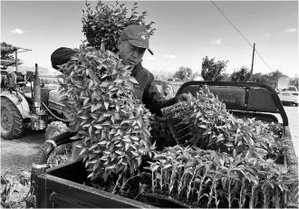 在上良镇荣旺村千亩辣椒基地里,两台滴灌定植一体机在田间来回穿梭,随着机器的前行,打孔、移栽、浇水等工序一气呵成。