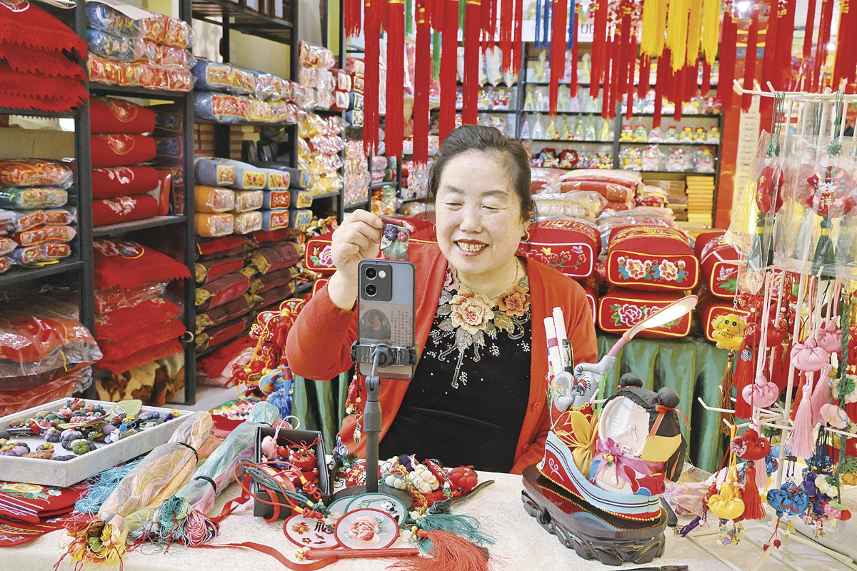 端午节临近,西峰区市场上各种香包饰品纷纷上市,生产企业通过线上线下销售,造型各异、做工精美的香包吸引了不少顾客观赏、选购,香包销售日渐升温。左图为庆阳市彩云手工刺绣有限责任公司负责人直播销售香包。 庆阳融媒记者 盘小美 摄