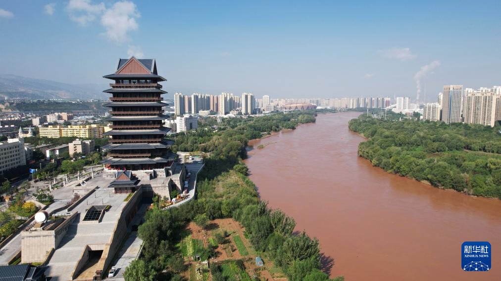 这是位于黄河兰州段南岸的黄河楼(2024年9月26日摄,无人机照片)。新华社记者 陈斌 摄
