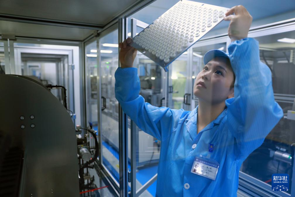 彩色隐形眼镜智能化生产线上,一名工人在查看产品。新华社记者 郭刚 摄