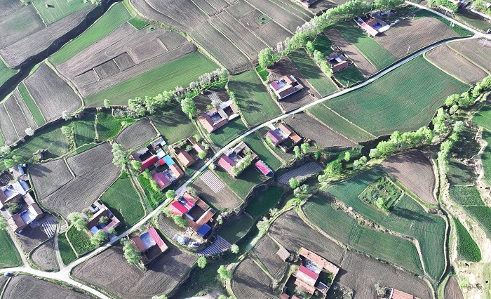 近日,位于祁连山北麓的甘肃省张掖市民乐县丰乐镇易家湾村绿意盎然,田园、民居与乡村道路共同构成一幅美丽的田园画卷。(王晓泾)