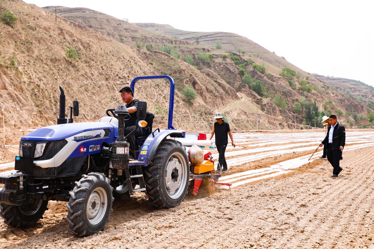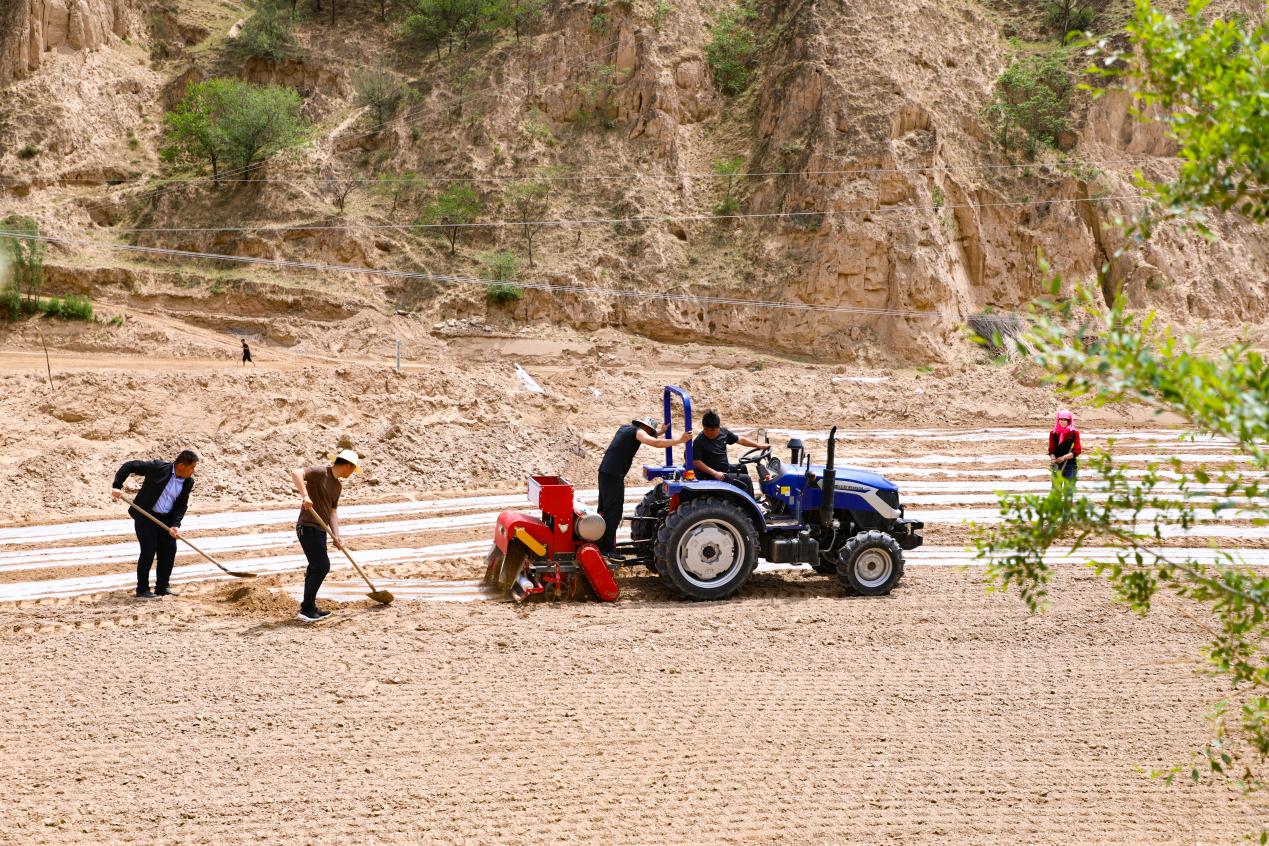 大旱遇墒情,农户们也热情高涨,一天到晚忙生产。在郝集村的农田,伴随着覆膜机的轰鸣声,银白色的地膜在阳光下整齐铺展,村民紧随其后覆土压实。成行的地膜在黄土地上勾勒出规整的线条,成为旱塬上一道独特的风景。“十年九旱的大西北,能在播种前等上一场雨不容易,所以大家心情都很激动。现在,有干部们帮忙,咱们更得抓紧,今年就靠这一遭了!”正在播种玉米的郝集村村民郝汉智说。一旁覆土的其他村民接过话茬:“抢墒抢种就是为了抢发芽率,多干一会儿,秋粮丰收就多一分希望!”