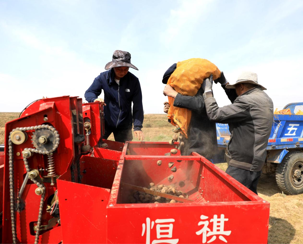 “突突突——”在山城乡薛塬村,几台深松机、旋耕播种施肥一体机正在田间来回穿梭,村民们扛着一袋袋饱满的马铃薯种薯,麻利地倒入机器的种箱。