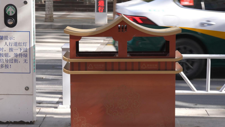 在敦煌市区主干道上,1800个以敦煌元素设计的文创果皮箱成为市民游客热议的焦点。这些果皮箱色彩选取敦煌壁画经典的赭石、金褐等色调,箱体绘有藻井、祥云等壁画符号。顶部流线型设计借鉴敦煌飞天衣裙的飘逸曲线,外形上简化了洞窟穹顶、佛龛拱门线条,弱化棱角,呼应石窟柔美弧线,增强了地域辨识度。同时,在敦煌主街道的路口处,新亮相的九色鹿主题行人信号灯引发市民游客驻足。不同于传统信号灯的静态图标,这套系统将《鹿王本生》壁画中的九色鹿形象提炼为简明动态图示,既保留壁画神韵,又符合交通标识清晰度要求。
