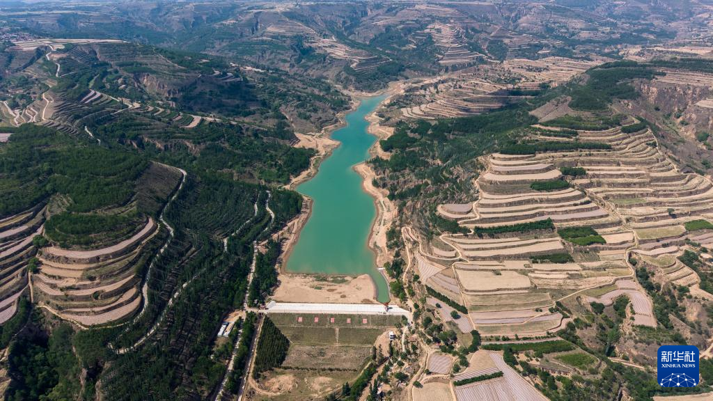 这是5月29日在庆阳市镇原县拍摄的吴家沟水库(无人机照片)。该水库2024年底刚完成综合利用改造,今年旱情期间保障了20万人生活生产用水安全。新华社记者 郎兵兵 摄