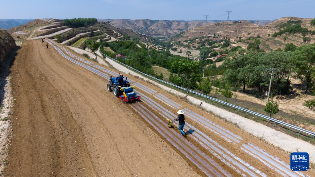 5月29日,在庆阳市镇原县郭原乡郭原村,村民一边用机械覆膜保墒一边播种玉米(无人机照片)。新华社记者 郎兵兵 摄