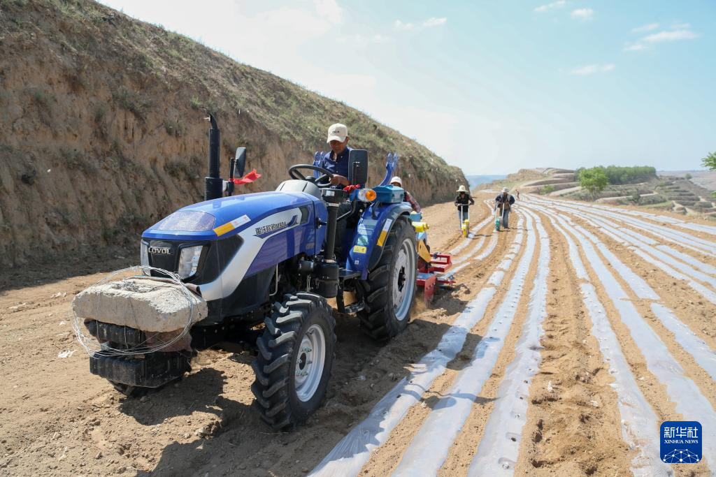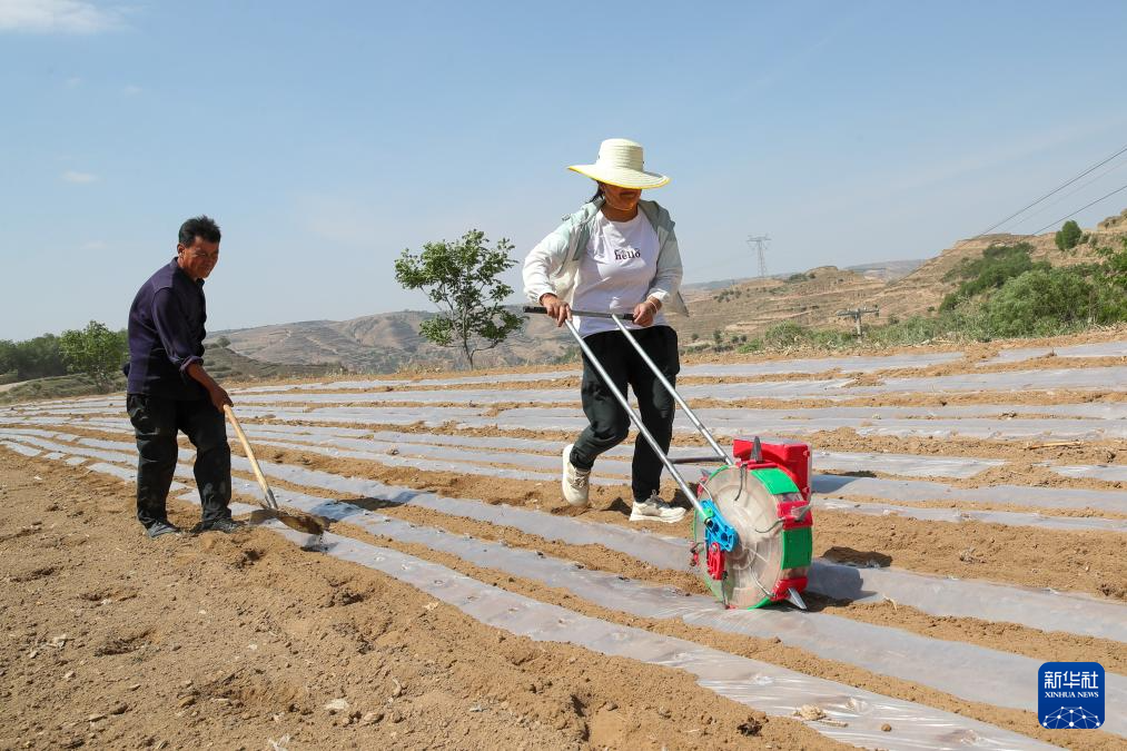 5月29日,在庆阳市镇原县郭原乡郭原村,村民一边用机械覆膜保墒一边播种玉米。新华社记者 郎兵兵 摄