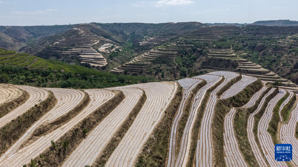 这是5月29日在庆阳市镇原县郭原乡郭原村拍摄的一片梯田,当地村民使用双垄沟播覆膜技术抗旱保墒(无人机照片)。新华社记者 郎兵兵 摄