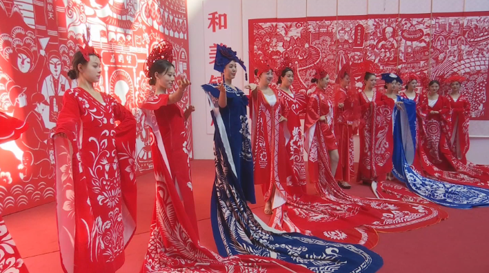 活动现场,多位国内外超模身着“剪云裳”剪纸服饰依次走上T台,走进展馆。这些服饰以我县剪纸大师祁秀梅的经典纹样为蓝本,将中国传统剪纸艺术与现代时尚设计巧妙融合。大V领、鱼尾裙、耸肩收腰等设计新颖别致,生命树、凤戏牡丹、鱼钻莲、抓髻娃娃等剪纸图案栩栩如生,红与青瓷蓝为主色调碰撞出强烈的视觉冲击力,每一步都摇曳生姿,举手投足间尽显东方韵味与国际时尚的完美融合,让现场观众大饱眼福,纷纷拿出手机拍照留念。