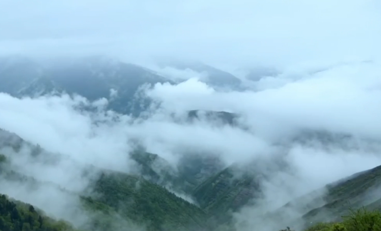 夏日时节,位于甘肃省甘南藏族自治州舟曲县境内的拉尕山迎来一场降雨。雨后的拉尕山山间云雾缭绕,仿佛一层薄纱覆盖在绿意盎然的峰峦之上,宛若人间仙境。(刘欣瑜、马志鹏)