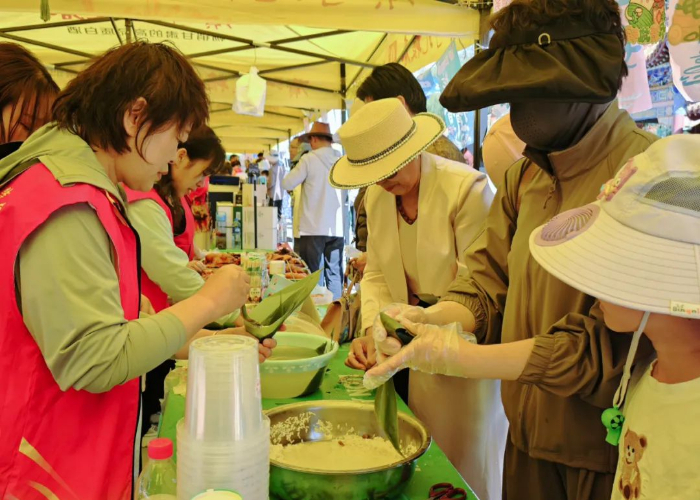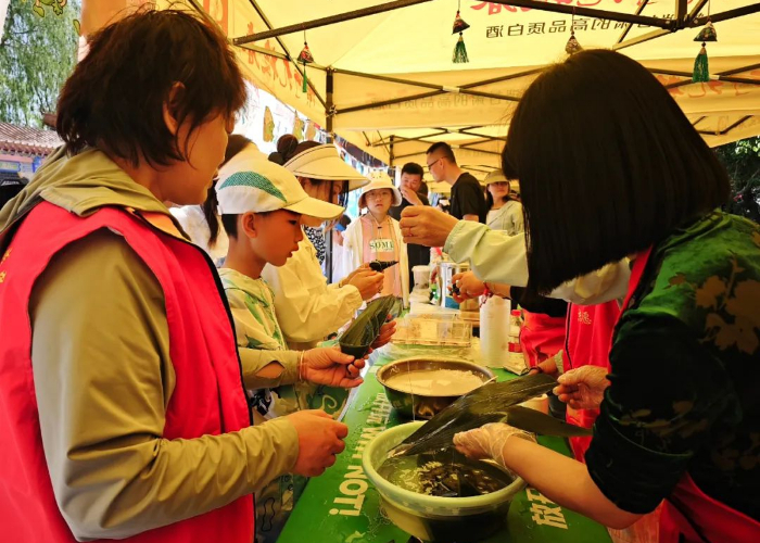 孩子们笨拙却认真的折叠叶角、填入馅料、捆扎成型,年长者耐心指点,手把手传递包裹着端午温情的智慧。“今天跟阿姨学了包粽子的方法,我想多包几个拿回家和家里人一起分享。”游客杨雨航说。