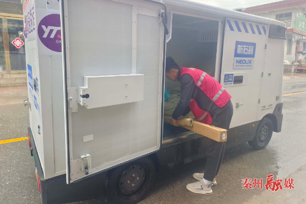 发往齐寿镇的无人驾驶快递车,经过市区繁华路段、皂郊镇陡峭路段,安全平稳行驶在路上,准时送达齐寿镇快递物流共配中心。
