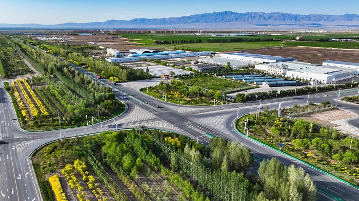 近日,甘肃省张掖市民乐县交通大林带工业园区段,道路两边高低错落的乔灌木搭配的相得益彰,车行其间宛若画中游。