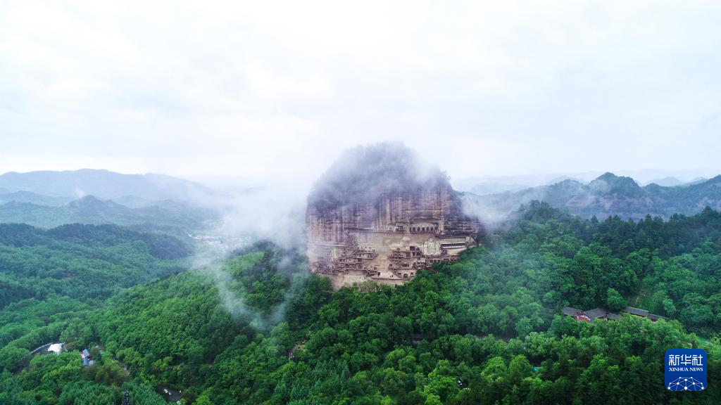 烟雨笼罩下的麦积山石窟。新华社记者 郎兵兵 摄