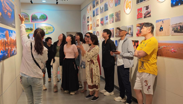 当大巴车缓缓驶入金塔沙漠胡杨林景区,参天的胡杨树映入眼帘时,网络作家蒋胜男难掩内心的震撼。“这和我印象里的大西北完全不一样,没想到能看到这么大面积的植被。”蒋胜男感慨道。随后,蒋胜男走进胡杨林美术馆,在讲解员的引导下,沉浸式了解金塔数十年来与沙漠抗争、建设绿色屏障的艰辛历程,感受一代代治沙人“与风沙赛跑”的顽强意志。