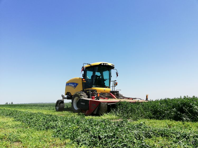在沙河回族乡河洲村苜蓿田间,大型牧草收割机徐徐驶过,茂盛的“绿色海洋”变成了“条纹地毯”,收割后的苜蓿草通过晾晒、打捆等工序,就变成了牛羊可口的饲料。