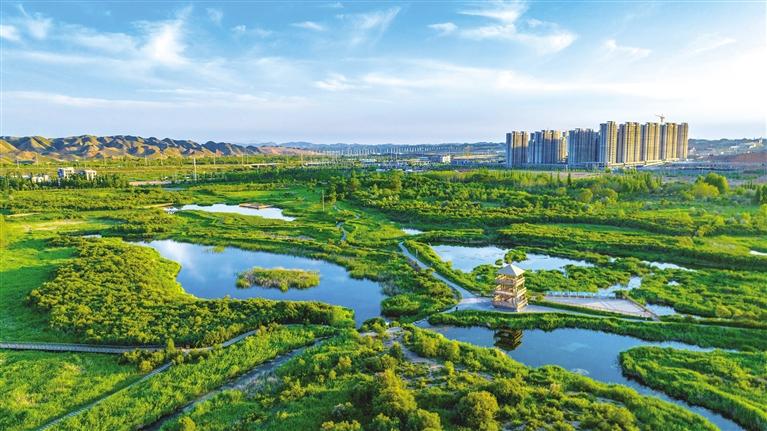 沿着百花公园一路向西,蜿蜒流淌的栖霞湖水,绘就了一条迷人的水景风光带,傍水而生带来的生态画卷和人文景观,让秦王川国家湿地公园变成了美轮美奂的城市打卡之地,让更多市民分享生态改善带来的美好生活。