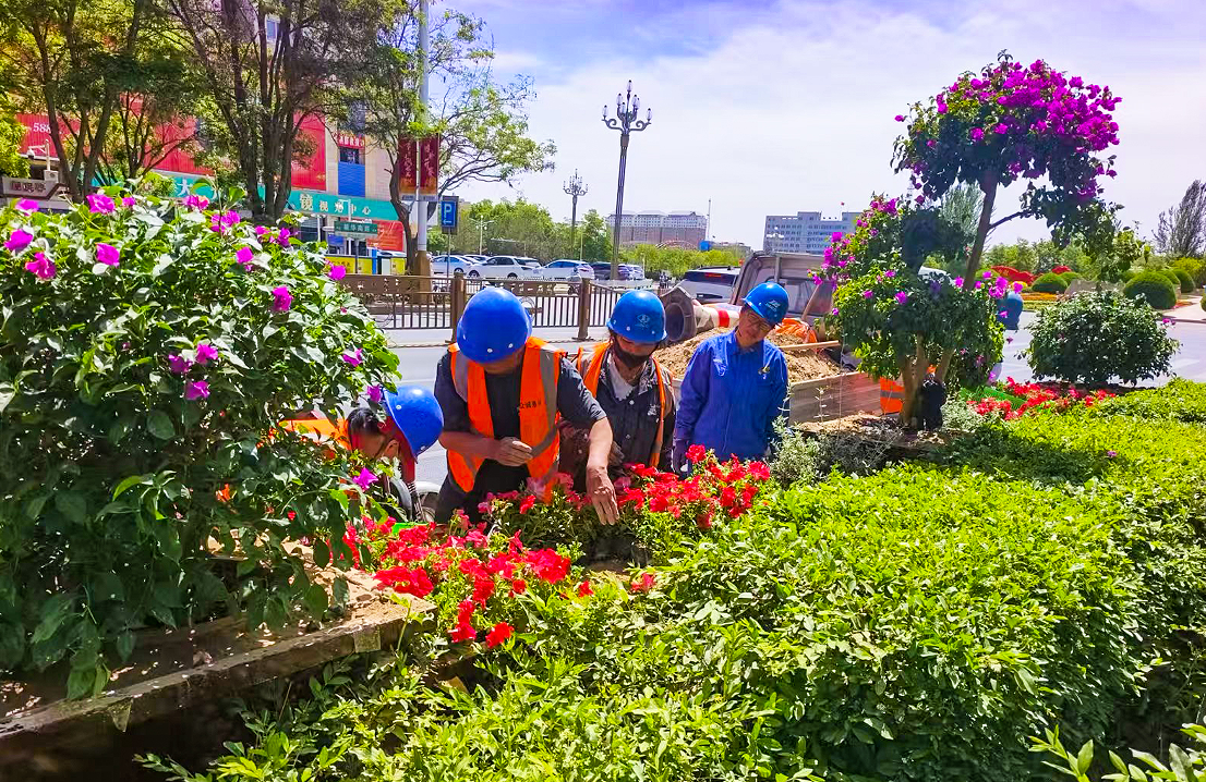 盛夏时节,满城飘花香。近日,嘉峪关市全面开展了夏季花卉布置工作,市林草局绿化部门工作人员加班加点,精心布置,在嘉峪关市主干道、沿路重要节点摆放三角梅、牵牛花等各类花卉,打造高质量立体花卉造型景观,用鲜花和绿植为城市街头再披新装,让精致城市“锦上添花”。