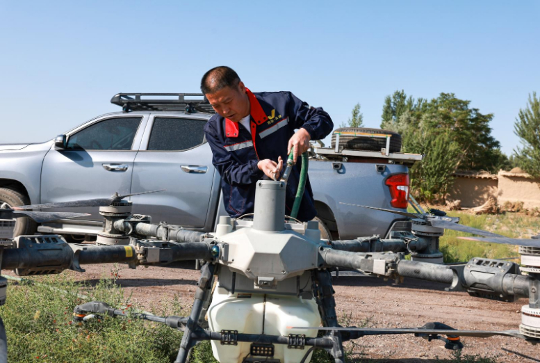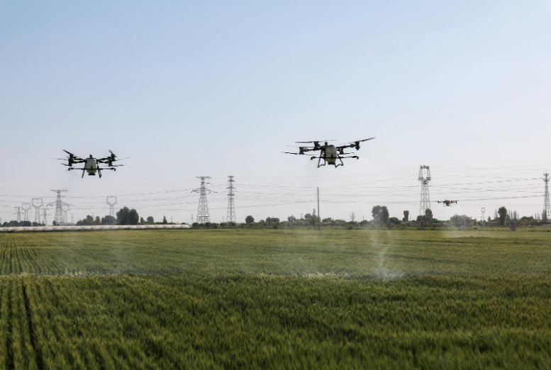 “无人机喷得快,效率高,所以人工成本能降低。对庄稼苗的损伤几乎为零,这也是增加产量的一个关键。”中国农垦金塔县东坝万亩粮田基地项目经理王培乾说。
