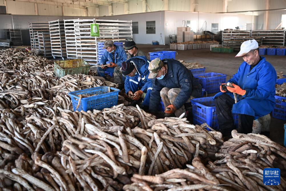 2024年12月24日,在位于金塔县鼎新镇的大漠农林生态产业股份公司,工人们在分拣肉苁蓉。新华社记者 范培珅 摄