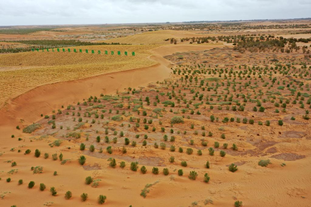 在民勤昌宁西沙窝项目现场,人工种植的梭梭等沙生植物长势良好(无人机照片)。新华社记者 郭刚 摄