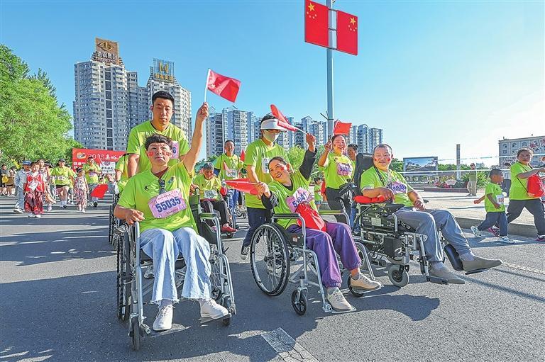 残障人员在陪跑员的陪伴下参赛。 李巍