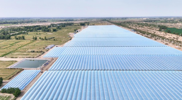 在金塔县中东镇梧桐坝村,设施瓜菜产业园项目建设正酣,工人们正忙着搭建拱棚,一座座“银龙”拔地而起。在已建成的大棚内,新育的瓜菜苗郁郁葱葱,长势喜人,焕发出勃勃生机,一旁建成的蓄水池也已投入使用。