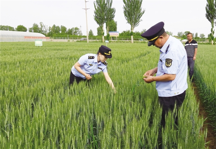 6月7日午后,金塔县地表温度逼近50℃。在金塔县农业科技创新示范园区,金塔县农业技术推广中心几名技术人员细致查看大田小麦、玉米长势。土壤变化和粮食成长的每个细节都逃不过他们的“火眼金睛”。