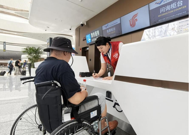 “小红帮您”帮轮椅旅客办理登机。王琳/摄