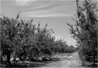 大白鹅在苹果树下追啄蚂蚱。