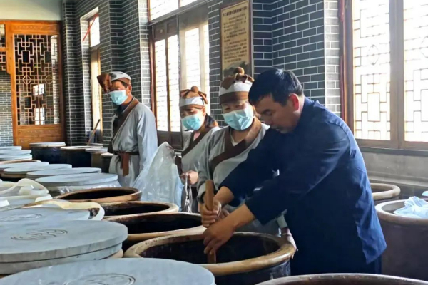 车间里,工人师傅们正拿着长柄大耙逐一对醋缸进行有氧搅拌。原料经过多次上下搅拌,氧气得到充分均匀吸收,醋酸的发酵才能顺利进行下去,适宜有益微生物生长,其中产生的氨基酸、有机酸、糖类、维生素和盐等,能够有效地促进人体新陈代谢,起到食疗食补的作用。