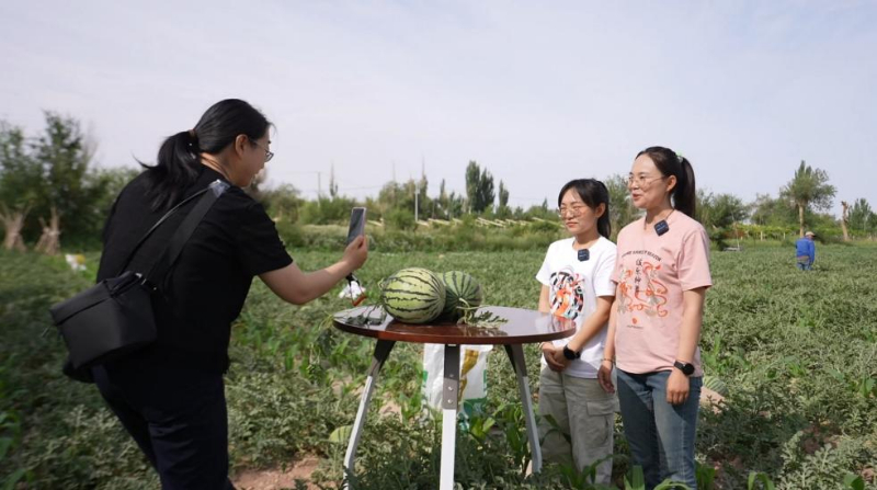 与此同时,敦煌市肃州镇河州堡村的西瓜也进入成熟采摘期。田间地头,西瓜藤蔓相互缠绕,一个个长势喜人的西瓜点缀其间。村民黄贵芬分享了辨别成熟西瓜的诀窍:“熟好的西瓜瓜棱饱了,皮也黄了,个头也大了,敲的时候声音闷闷的。”当地“网红”——“河西姐妹花”也为田间为瓜农拍起了宣传短视频,她们以幽默风趣的语言,生动展示了当地西瓜“甜、脆、多汁”的特点。“河西姐妹花”成员牛馨怡表示,西瓜宣传视频拍摄效果良好,未来她们将更加关注农产品宣传,助力农户增收。