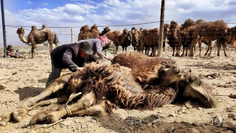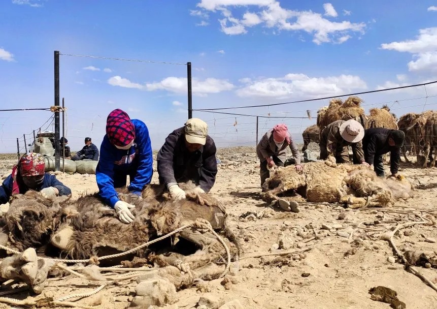 阳光洒在牧民们洋溢着笑容的脸上,他们的辛勤付出不仅是为了帮助骆驼健康度夏,也是为了收获这珍贵的骆驼毛,为生活增添一份保障。