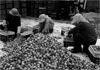 在界石铺镇高堡村果商代办李永强的杏子收购点,鲜红的大接杏在遮阳棚下分类堆放,七八名工人紧张有序地分拣、装箱、装车。