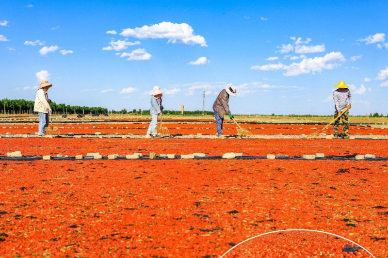 6月26日,嘉峪关市宏源公司的1.89万亩头茬枸杞喜获丰收,种植户们抢抓晴好天气采摘、晾晒,田间地头、戈壁晾晒场构成一幅红彤彤的丰收景象。
