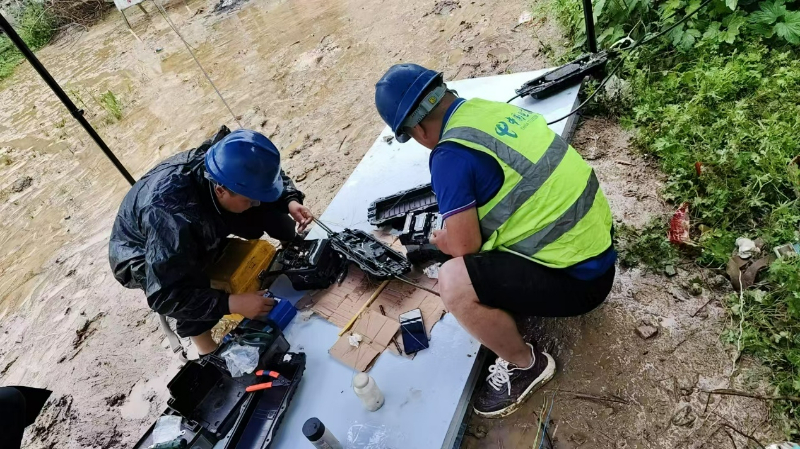 应急保障过程中,一线人员分工明确,肩扛光缆、油机、应急通信等设备,徒步进入受灾区域,争分夺秒排查故障。