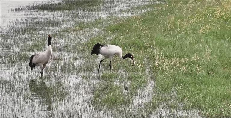 在已开展的几次鸟类监测中,首次监测到小群(6只)国家一级重点保护鸟类黑颈鹤,为历年之最,并监测到黑颈鹤捕食赤嘴潜鸭雏鸟的画面;首次监测到国家“三有”保护鸟类凤头、白骨顶鸡在保护区的繁殖巢穴,填补了以上两个物种繁殖监测记录的空白。截至目前,监测人员已利用无人机监测到赤嘴潜鸭、赤麻鸭、灰雁、凤头、白骨顶鸡、红脚鹬和黑翅长脚鹬等繁殖鸟类15种2000多只,夏季繁殖鸟类监测取得新成效。