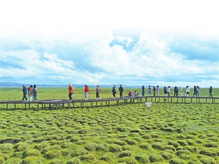 甘津文旅资源对接考察团成员在甘南天池冶海北岸拍照。