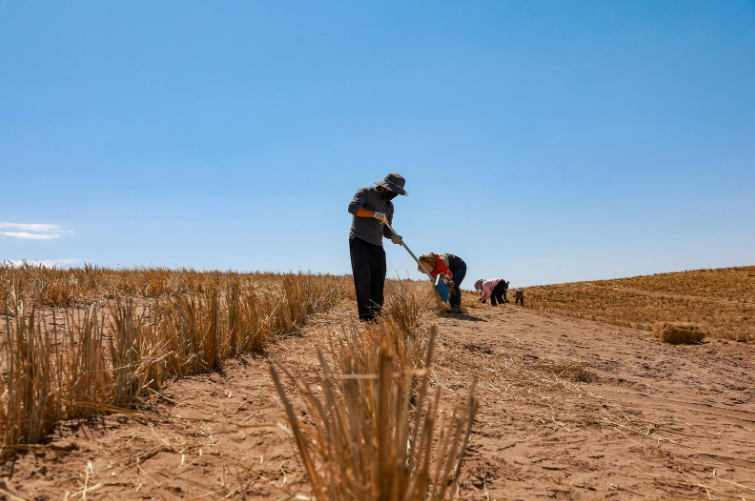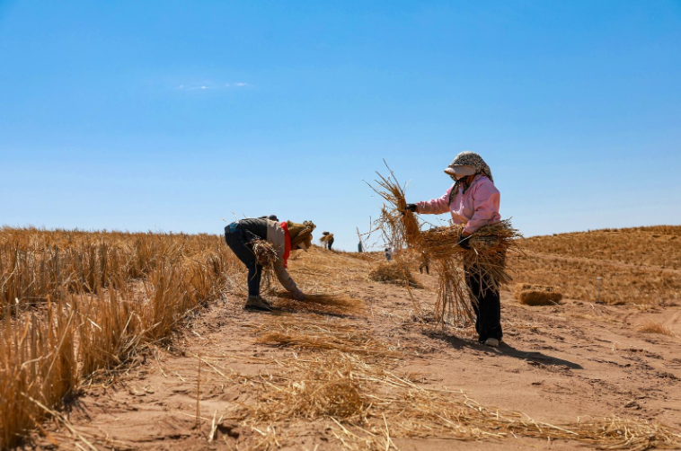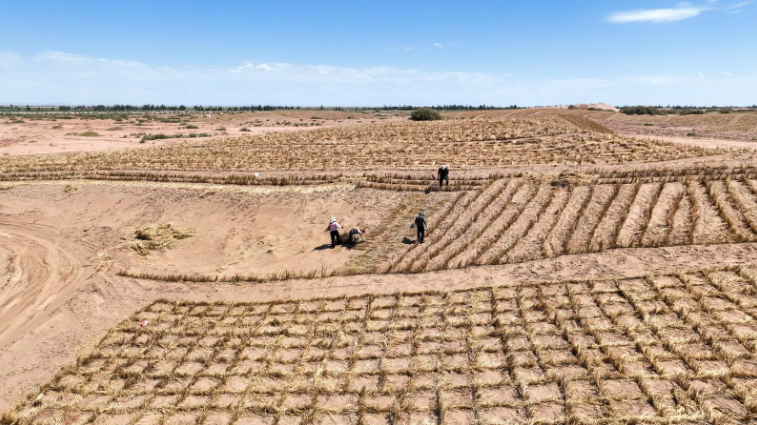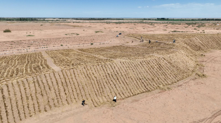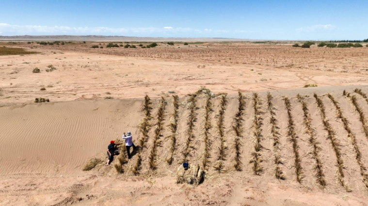 近日,在金塔至大墩门公路沿线“三北”工程防沙治沙项目现场,工人正在将稻草压入沙中制成草方格沙障,一排排整齐的草方格逐渐在沙地上蔓延开来,宛如一张巨大的绿色防护网,将流动的沙丘牢牢锁住。
