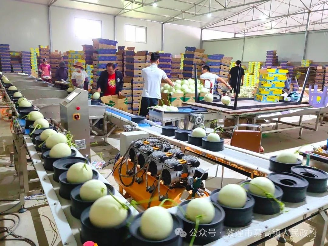 从田间到市场,新鲜采摘的蜜瓜很快被运至镇上的分拣打包点。分级、称重、装箱……蜜瓜分拣打包点同样一派繁忙景象。