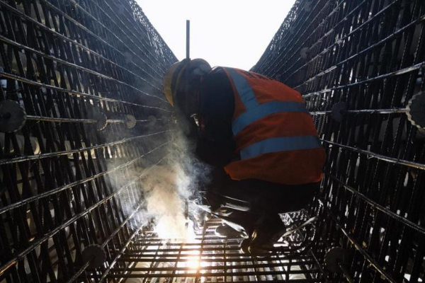 G109线水范项目箱梁预制厂的工人们正在焊接钢筋