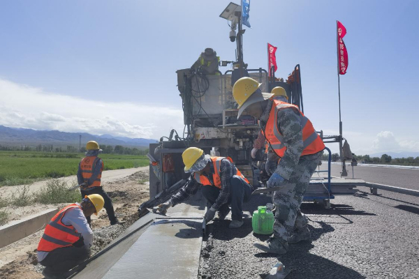 G312线丰马项目全长52.167公里,新建的26.1公里的油路面层已经铺筑成型,高路基边坡网格内新植草皮在塑料薄膜下已经泛绿,工人们正在烈日下,配合滑模摊铺机正进行路肩和挡墙的施工。另外,穿行村镇的26.067公里,已经完成了水泥稳定土基层的铺筑。项目办副主任齐占鹏告诉我们,项目创新采用四大提速措施:“见缝插针”优先施工非征迁段,“挂牌督办”动态管控节点进度,“错峰调配”共享标段关键设备,“挂图作战”开展劳动竞赛,以确保年底建成通车。