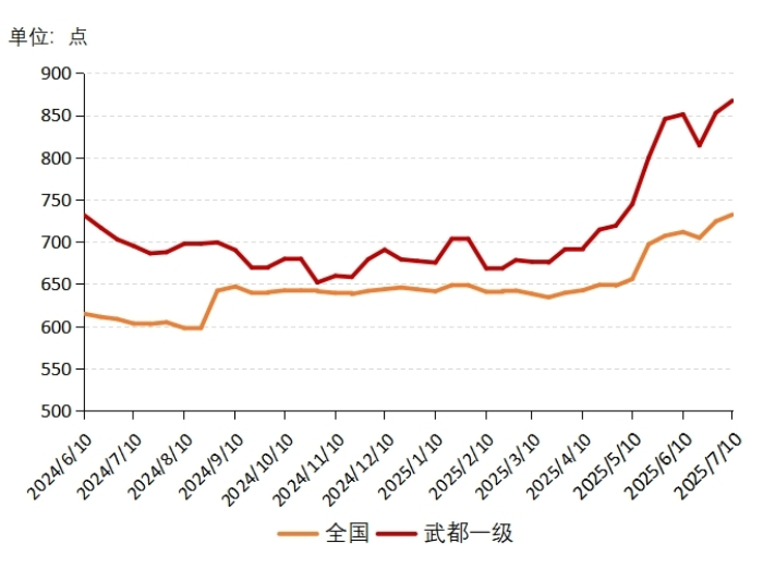 图为2024-2025产年全国综合花椒指数与武都综合花椒指数走势对比图