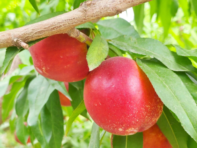 “你尝一下,我这颗比你的甜!”张婶举着刚摘的油桃凑过去,李叔咬了口直咂嘴,汁水顺着手指往下滴。两人对着竹篮里的果实比甜度,笑声惊得桃叶沙沙响,红果在篮子里晃出蜜色光晕。