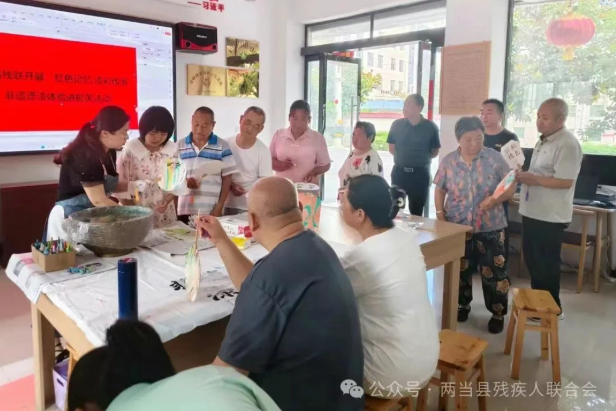 活动中,两当县文化馆工作人员介绍了漆扇的工艺特色和制作方法,让大家都感受到了漆艺的实用性与艺术性完美结合的独特魅力。随后,在工作人员的示范和指导下,大家以漆做笔,以水做画,纷纷按照自己对颜色的喜好进行配色,将团扇浸入漆盆,让漆色在扇面上自由流淌。本次活动为残疾人提供了近距离接触、体验优秀非物质文化遗产的机会,提升其文化获得感、幸福感,进一步促进了社会融合,搭建残疾人参与社会文化活动的平台,增进社会对残疾人的理解与接纳。通过动手实践,感受非遗技艺魅力,弘扬非遗,展现非遗的包容性与生命力,推动非遗在更广泛群体中的传播与传承。