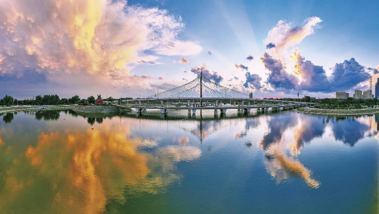 7月29日,西峰城区迎来一场降雨。雨过天晴后,彩虹桥上空惊现绝美晚霞。落日余晖将天空染成橙红色,与彩虹桥的绚丽色彩相互映衬,波光粼粼的水面也被染上金色,美不胜收。 庆阳融媒记者 陈飞 摄