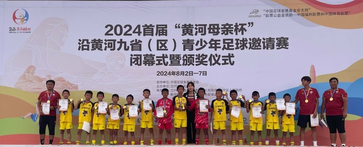 在2024“黄河母亲杯”沿黄河九省(区)青少年足球邀请赛上,青海曲麻莱克瑞斯代表队站上U11组别冠军领奖台。(新华网)