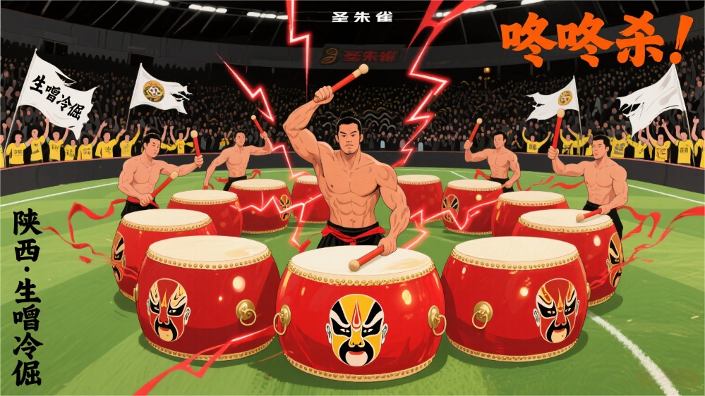 陕西“生噌冷倔”:生(热情似火)、噌(直来直去)、冷(冷静执着)、倔(宁折不弯)。八面直径一米的巨鼓阵列球场,鼓点“咚咚杀!咚咚杀!”如惊雷炸裂,配合万人“狼啸”,堪称物理+精神双重攻击。