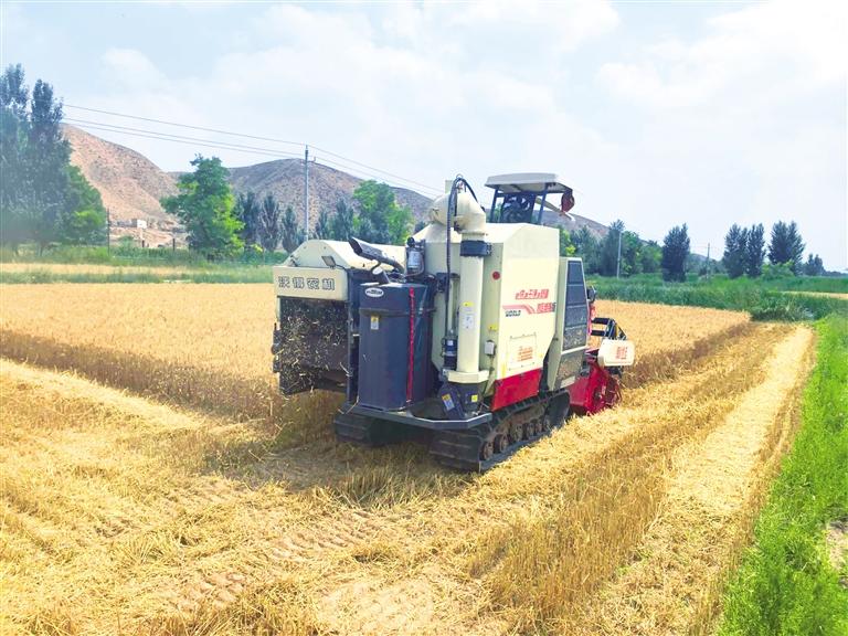 在龙泉寺镇大涝池村小麦地里,大型联合收割机开足马力,在麦田中穿梭忙碌,小麦收割、麦穗脱粒、专车拉运等步骤一气呵成。望着麦粒堆成的“小山”,村民们脸上洋溢着丰收的喜悦。“我种了200多亩,从种到收全程都是机械化作业。”大涝池村村民赵文斌说。